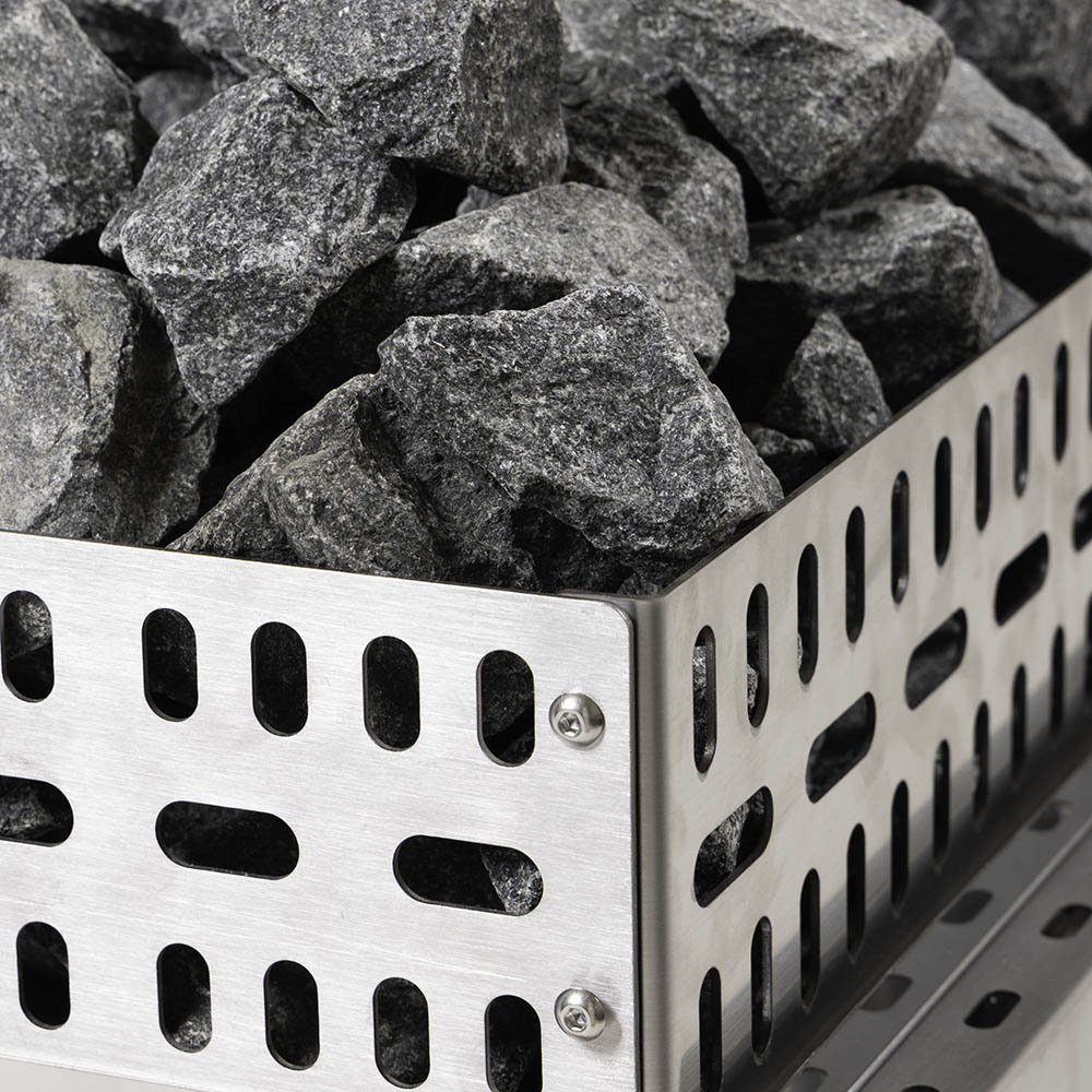 The included 20kg of Olivine Diabase sauna rocks (5โ10cm) provide exceptional heat retention and distribution. The stainless steel stove heats the space quicklyโreaching max temperature in just 30 minutesโwhile the rock basket prevents overheating and cracking, ensuring a long-lasting and efficient sauna session.